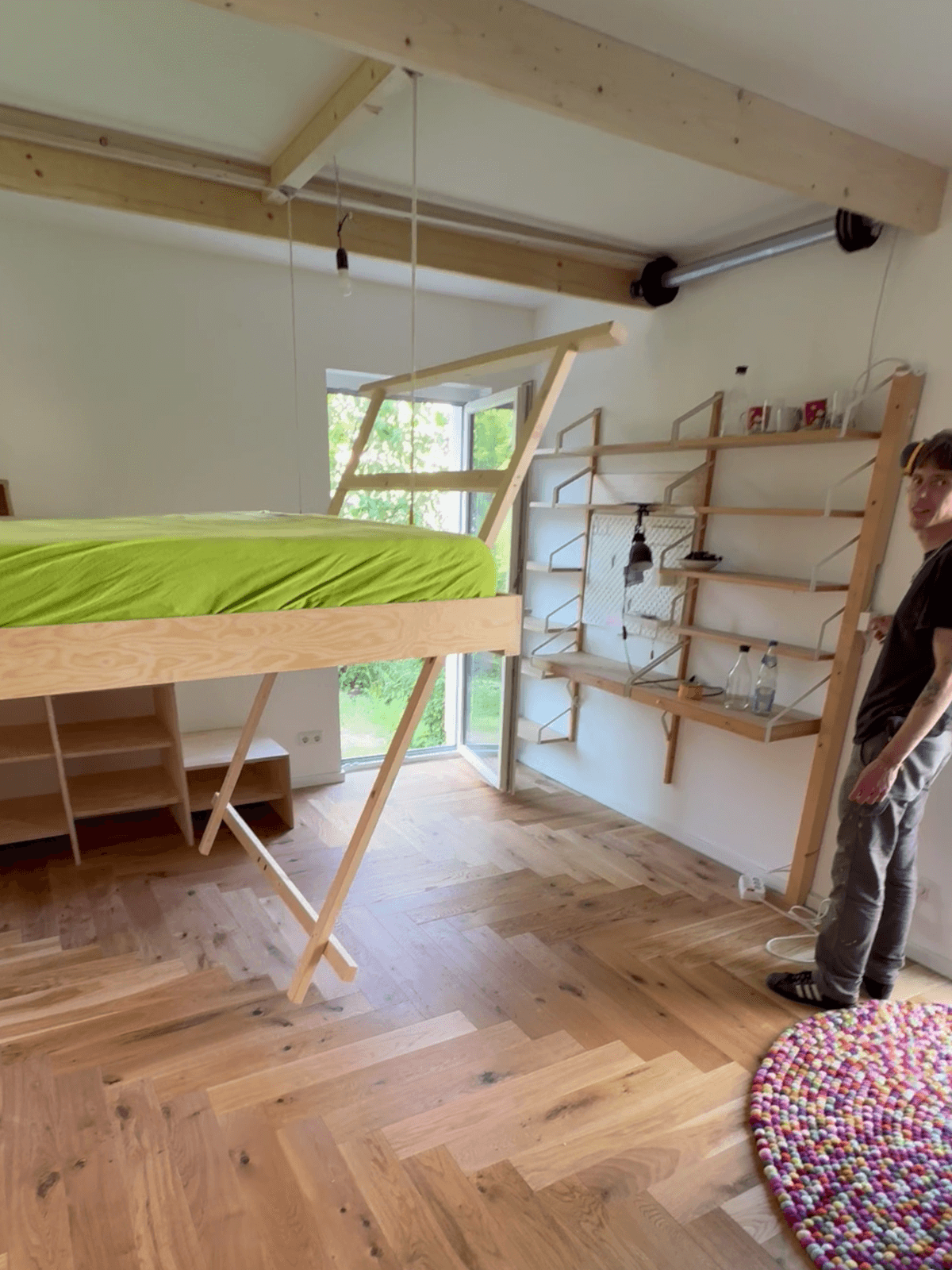 Kundenwunsch: Das Geländer soll sicher sein aber schön luftig und nicht so hoch. Diese Aufgabe stellt den Hochbettbauer vor eine Herausforderung. Stabil und grazil geht im Holzbau nicht so gern zusammen. In diesem Beispiel wurden Langlöcher in eine 18 mm starke Multiplexplatte (Birke) geschnitten. Das dreieckige Regal über der Tür sorgt als Verstrebung für zusätzliche Stabilität.